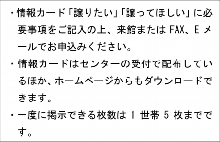 - 掲出できる枚数は、「譲りたい」「譲ってほしい」ともに1世帯5枚までです。