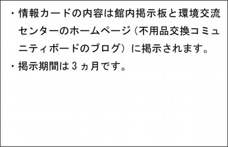 - ご利用の前に「不用品交換コミュニティボード」運用に係る内規を必ずお読みください。