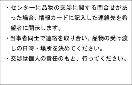 - 品物の受け渡し等については、双方で連絡を取り合い個人の責任で行って下さい。※当センターは関知しません。