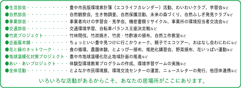私たちは、市民・行政・事業者などの様々な方たちと一緒に豊中の環境活動に取り組んできました。